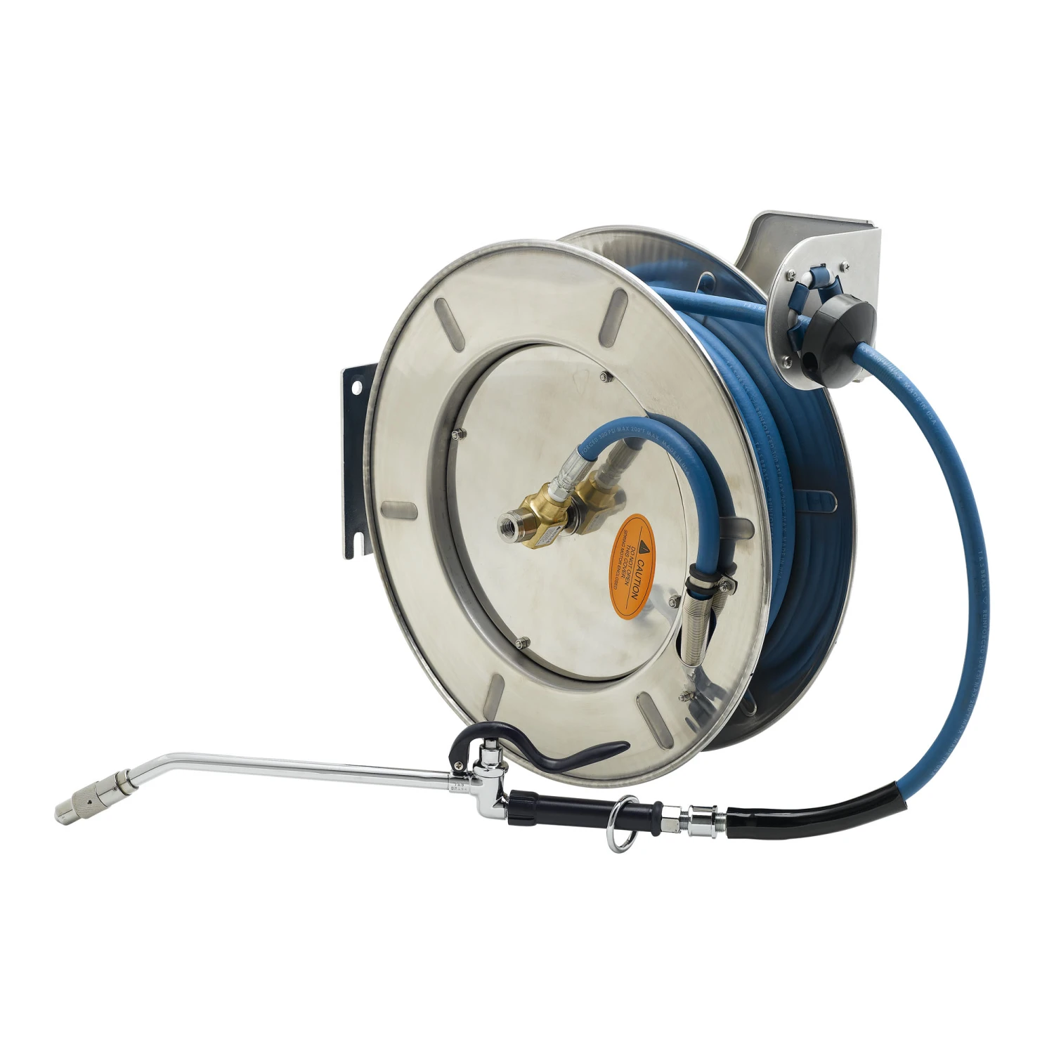 Open stainless steel hose reel, extended spray wand with swivel, 3/8" x 50' heavy-duty non-marking hose, ratcheting system, multi-fit bracket, adjustable hose bumper and 3/8" NPT female inlet.
