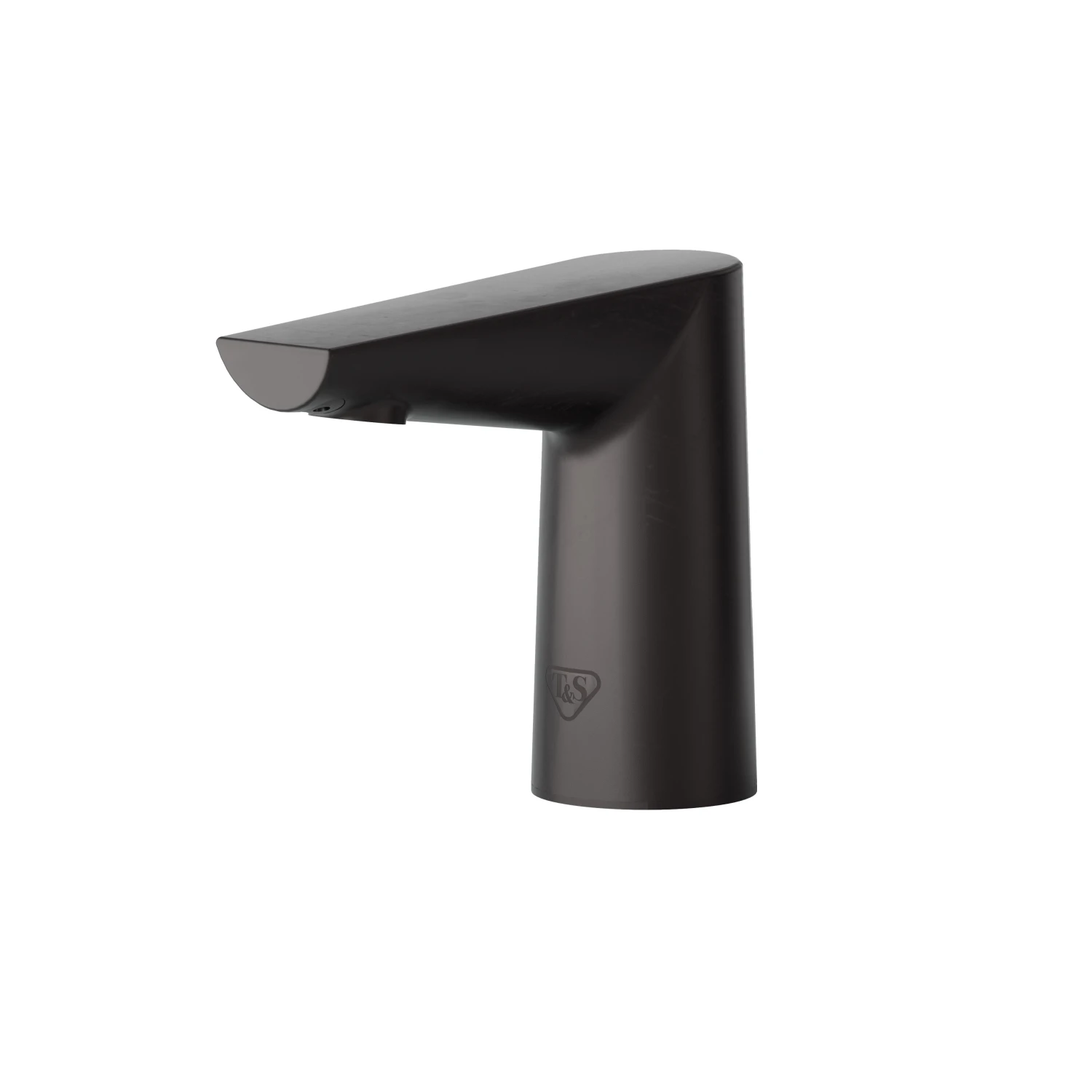 Single hole deck mount electronic sensor faucet with matte black brass body, cast spout, 0.5 GPM vandal resistant non-aerated spray device, hydro-generator power supply, AC/DC control module with internal flow control setting switches, temperature control mixing valve with integral check valves and 18" flexible stainless steel supply hoses with 3/8" compression connections. Certified to ASME A112.18.1/CSA B125.1, NSF 61-Section 9,NSF 372 and UL 1951. Meets ADA ANSI/ICC A117.1 requirements.